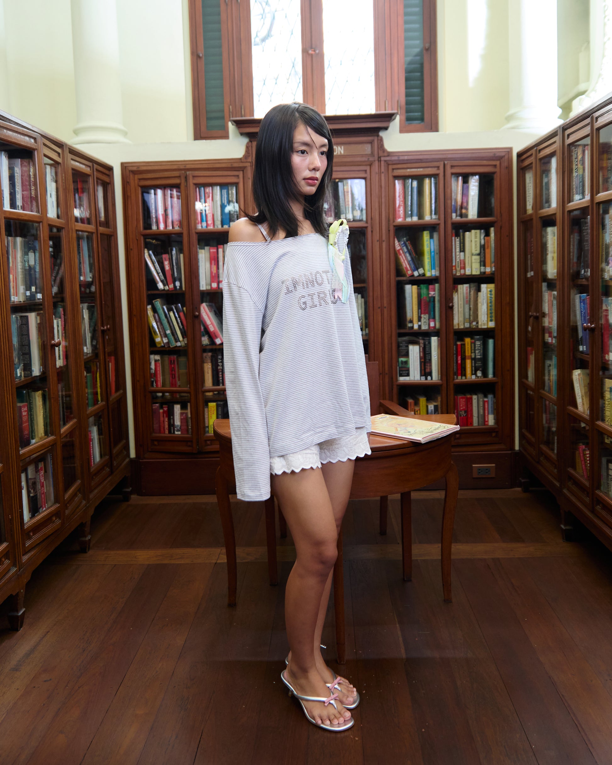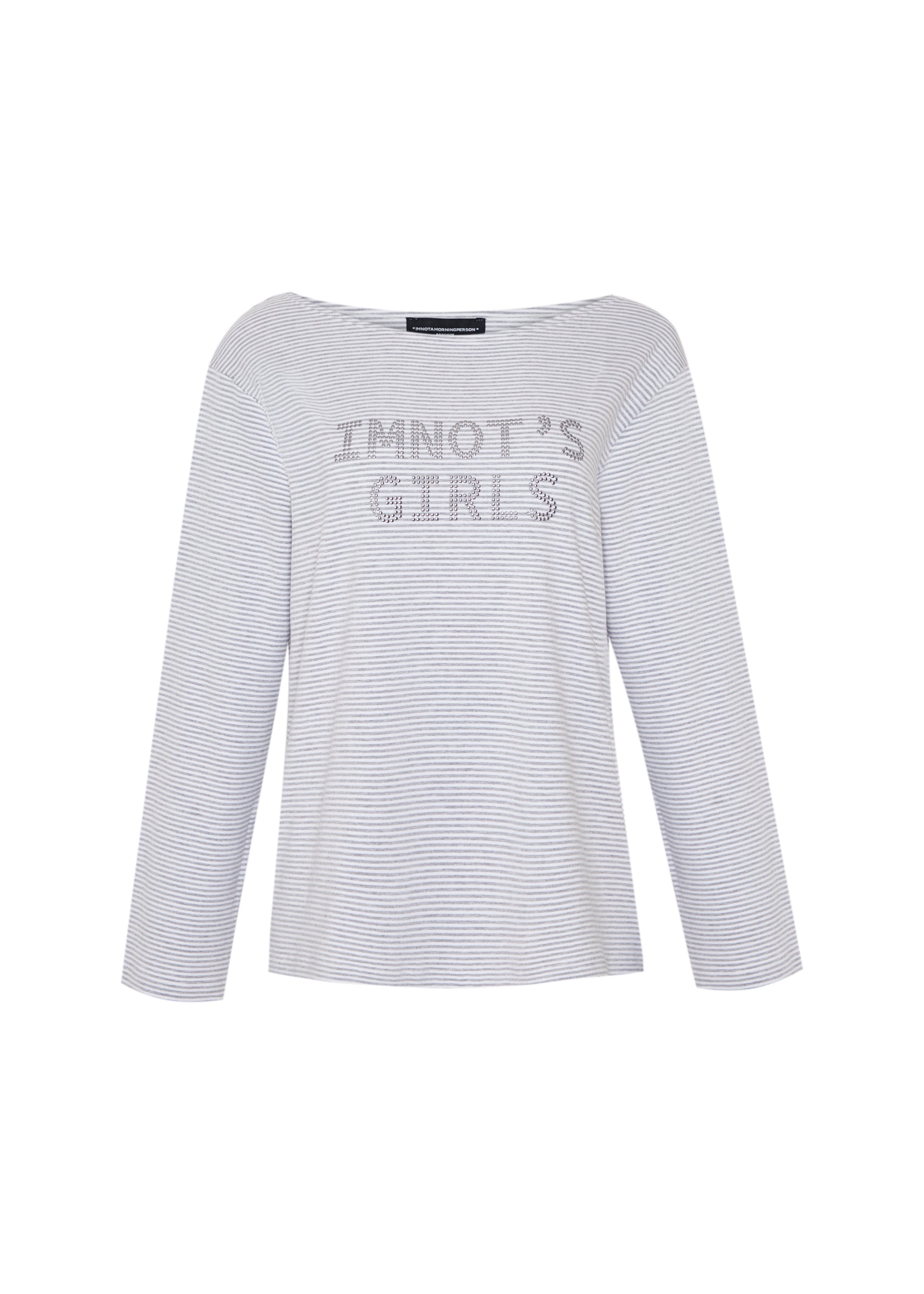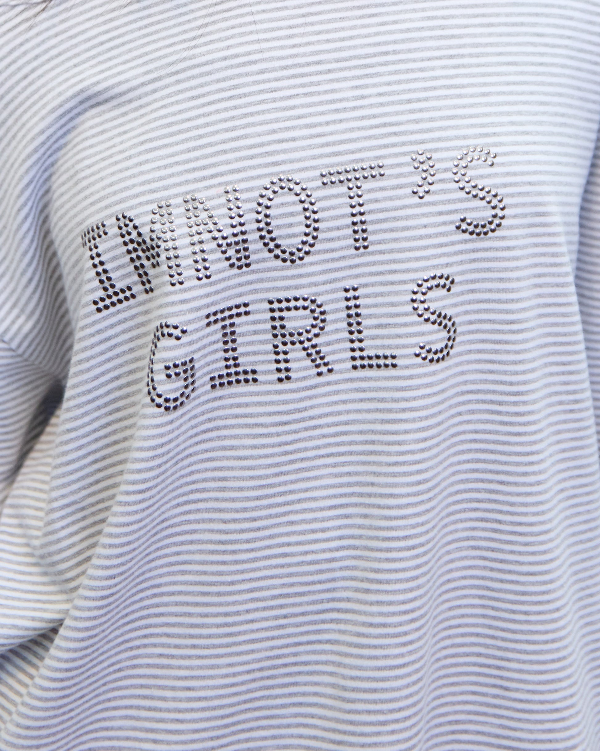 Our classic soft striped cotton with an oversized off-shoulder fit. Grey and White stripes adorned with studs.