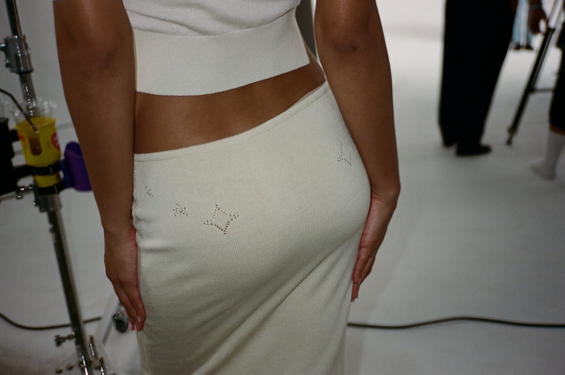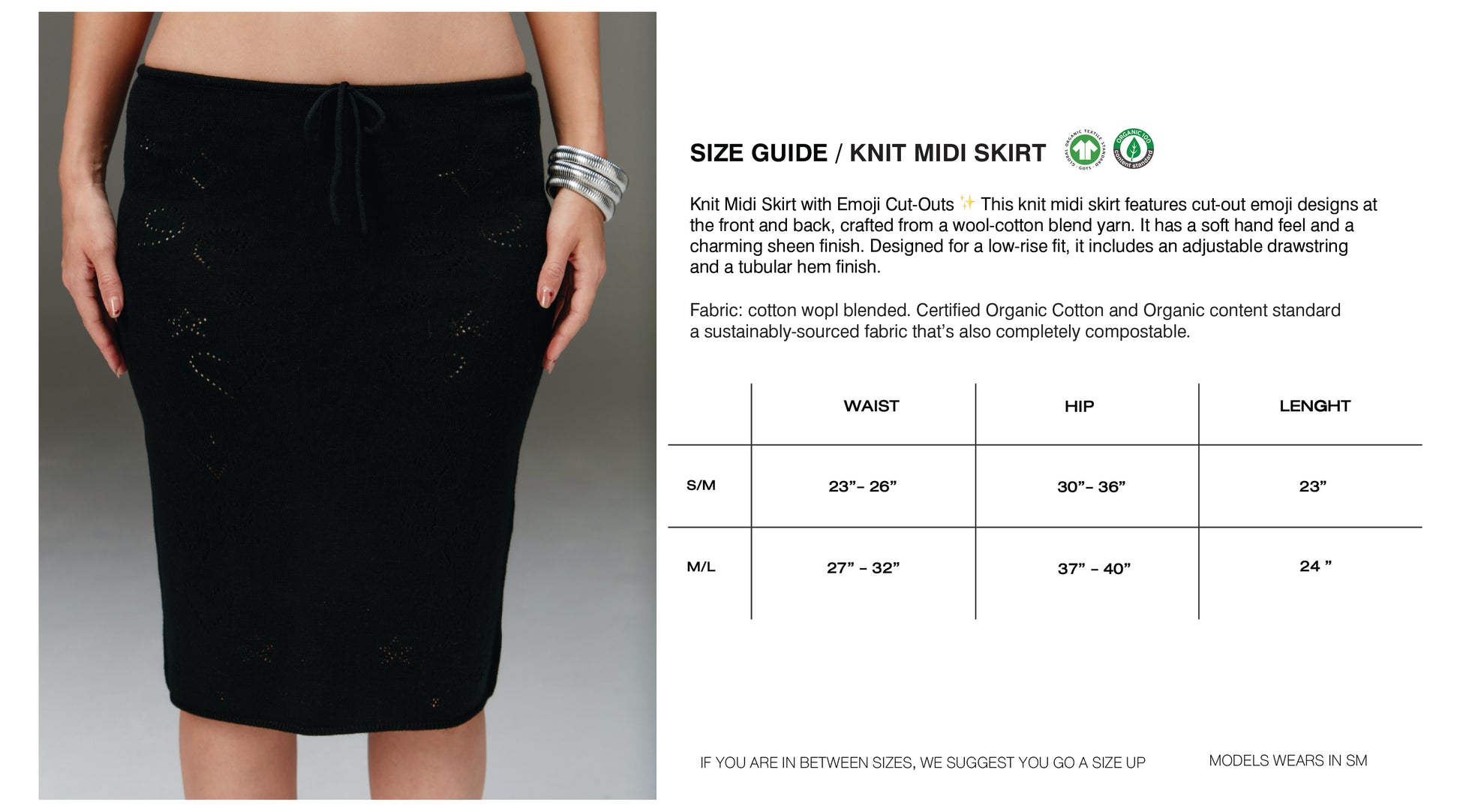 Knit Midi Skirt with Emoji Cut-Outs ✨ This knit midi skirt features cut-out emoji designs at the front and back, crafted from a wool-cotton blend yarn. It has a soft hand feel and a charming sheen finish. Designed for a low-rise fit, it includes an adjustable drawstring and a tubular hem finish