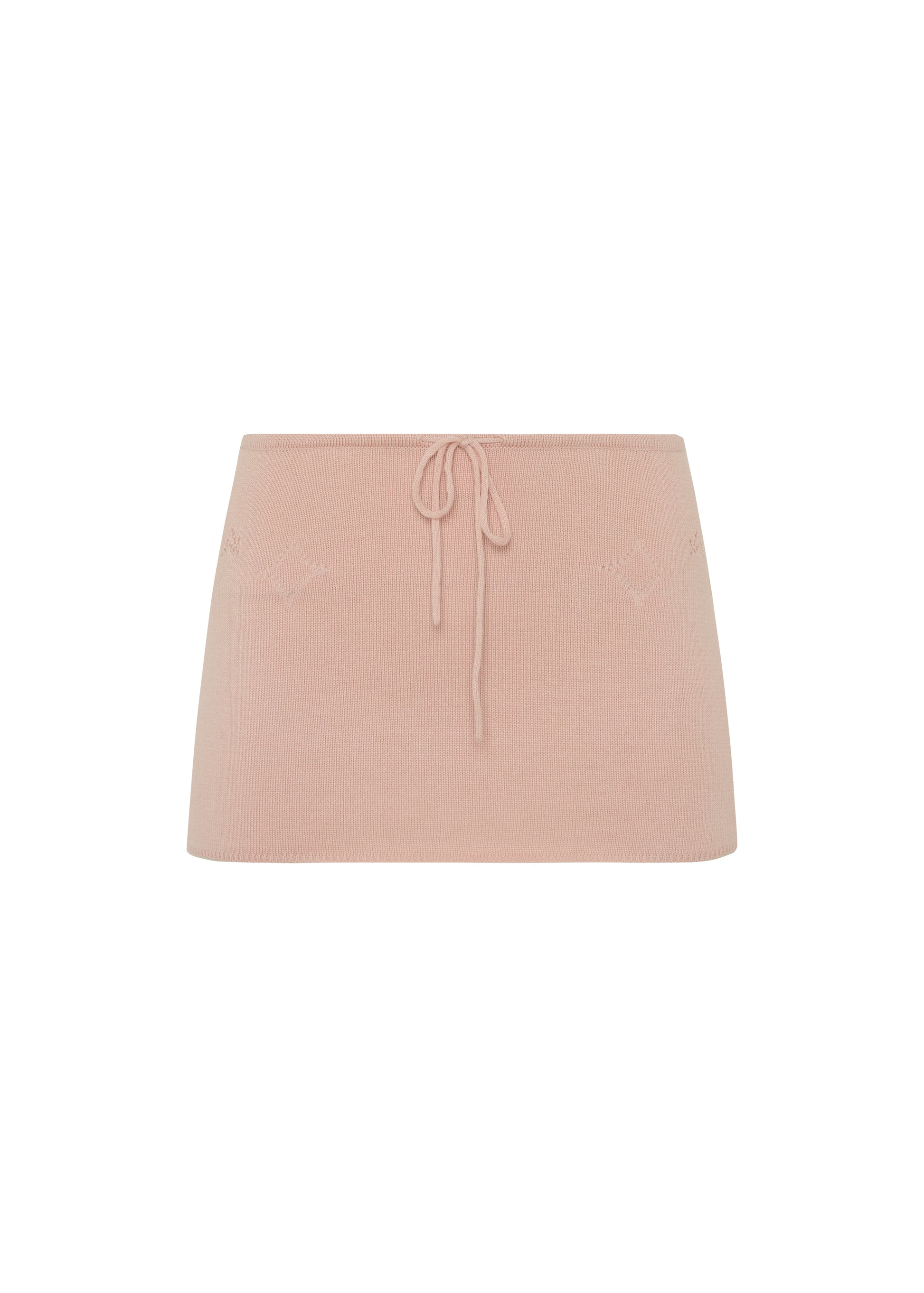 Knit Mini Skirt with Emoji Cut-Outs ✨ This knit mini skirt features cut-out emoji designs at the front and back, crafted from a wool-cotton blend yarn. It has a soft hand feel and a charming sheen finish. Designed for a low-rise fit, it includes an adjustable drawstring and a tubular hem finish.