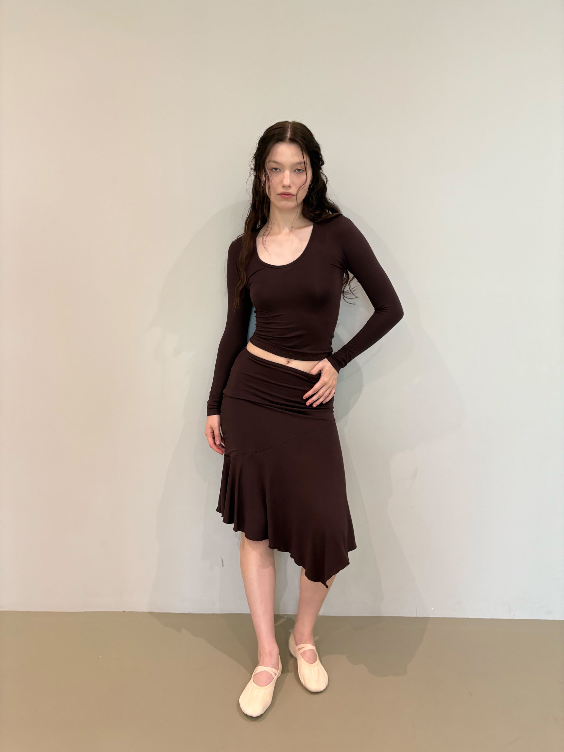 Crafted from soft, breathable rayon jersey, this fitted silhouette gently hugs the body for a smooth, flattering look. Finished with a clean scoop neckline and long sleeves, it’s a timeless essential that pairs perfectly with skirts or lounge bottoms for both at-home comfort and refined everyday wear.