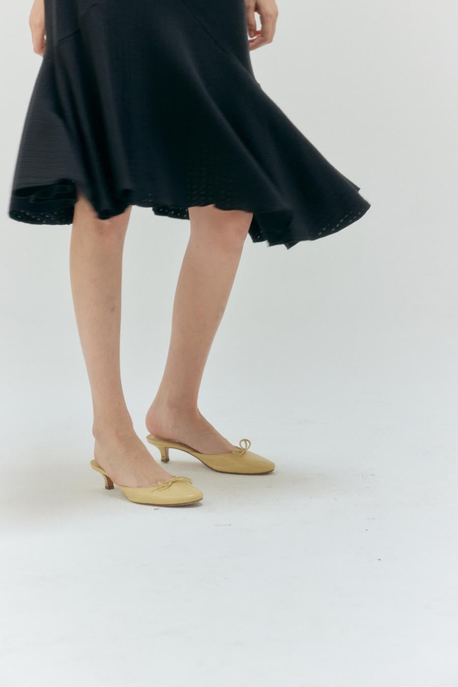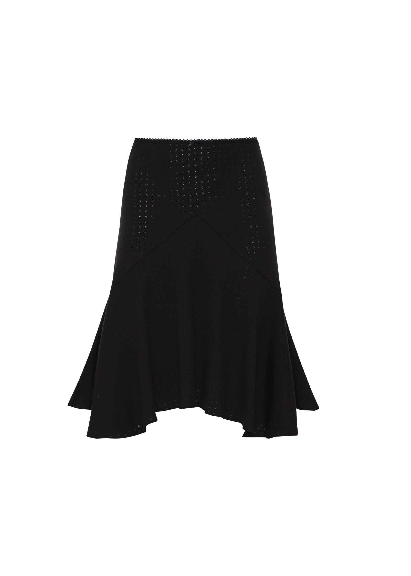 The "Pointelle Love Midi Skirt" features an elasticized waistband, a ruffled asymmetric hem, scalloped picot-trim detailing, and a petite center-front bow, adding a charming and lovely touch to any outfit. made from 100% cotton pointelle