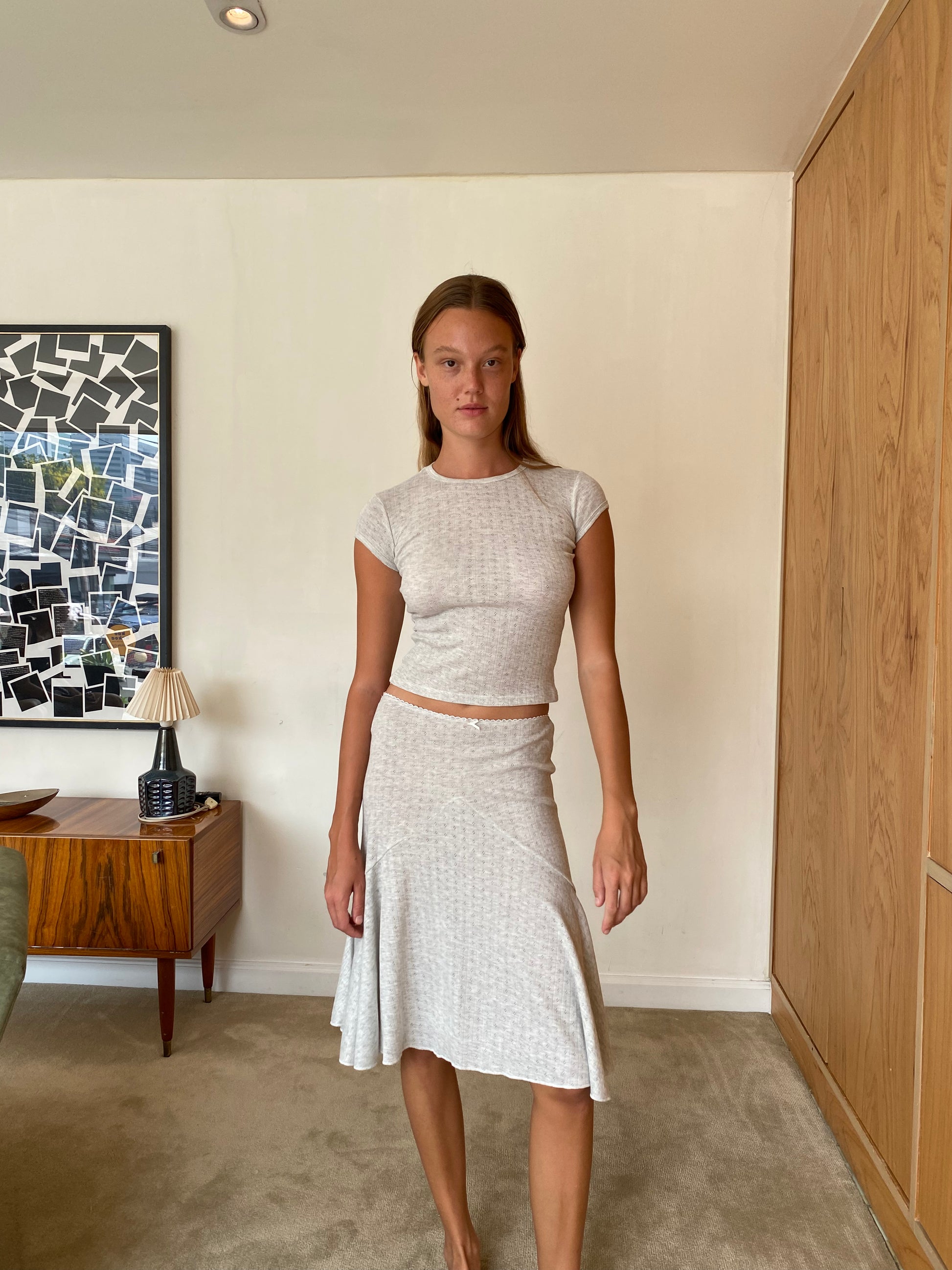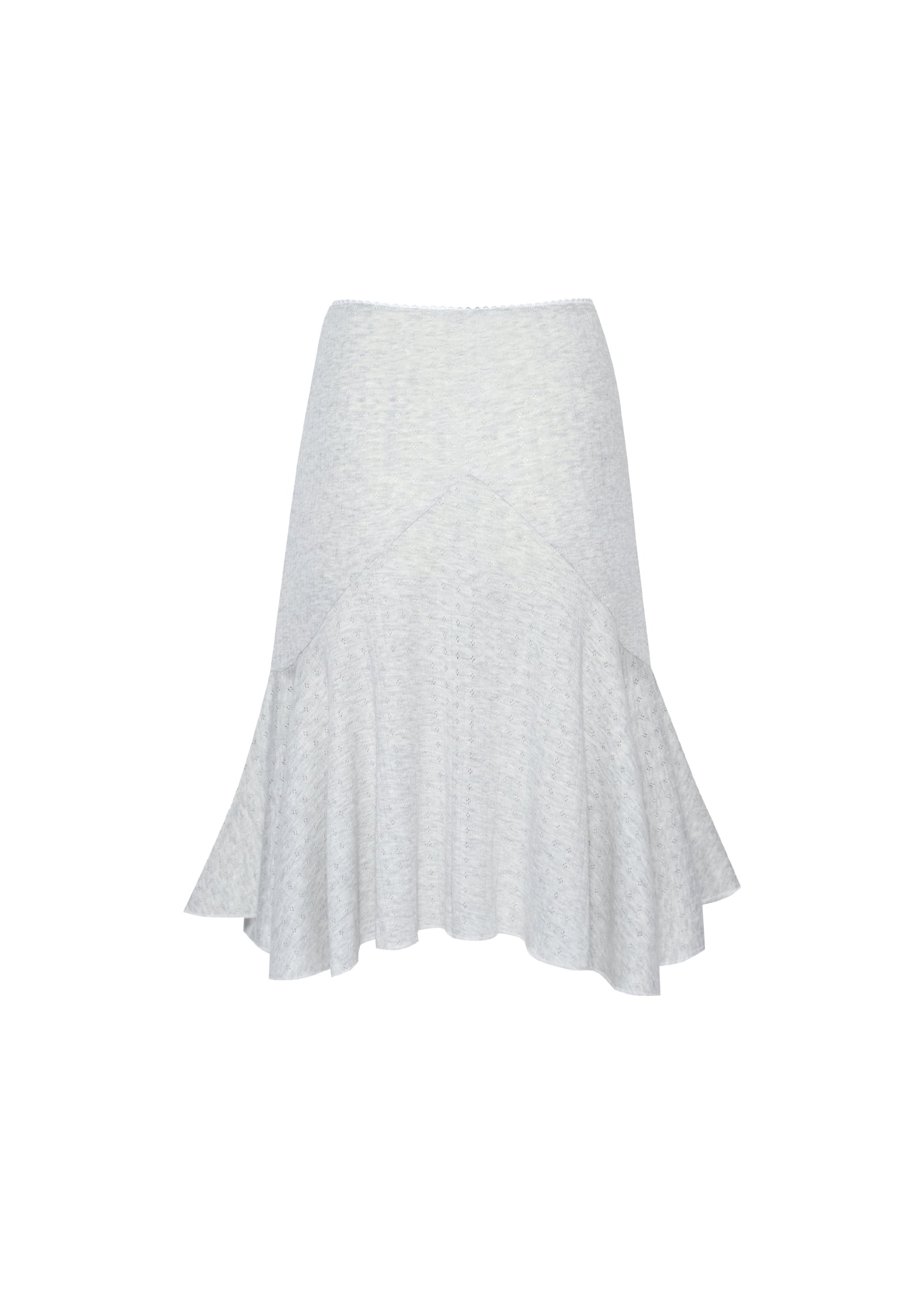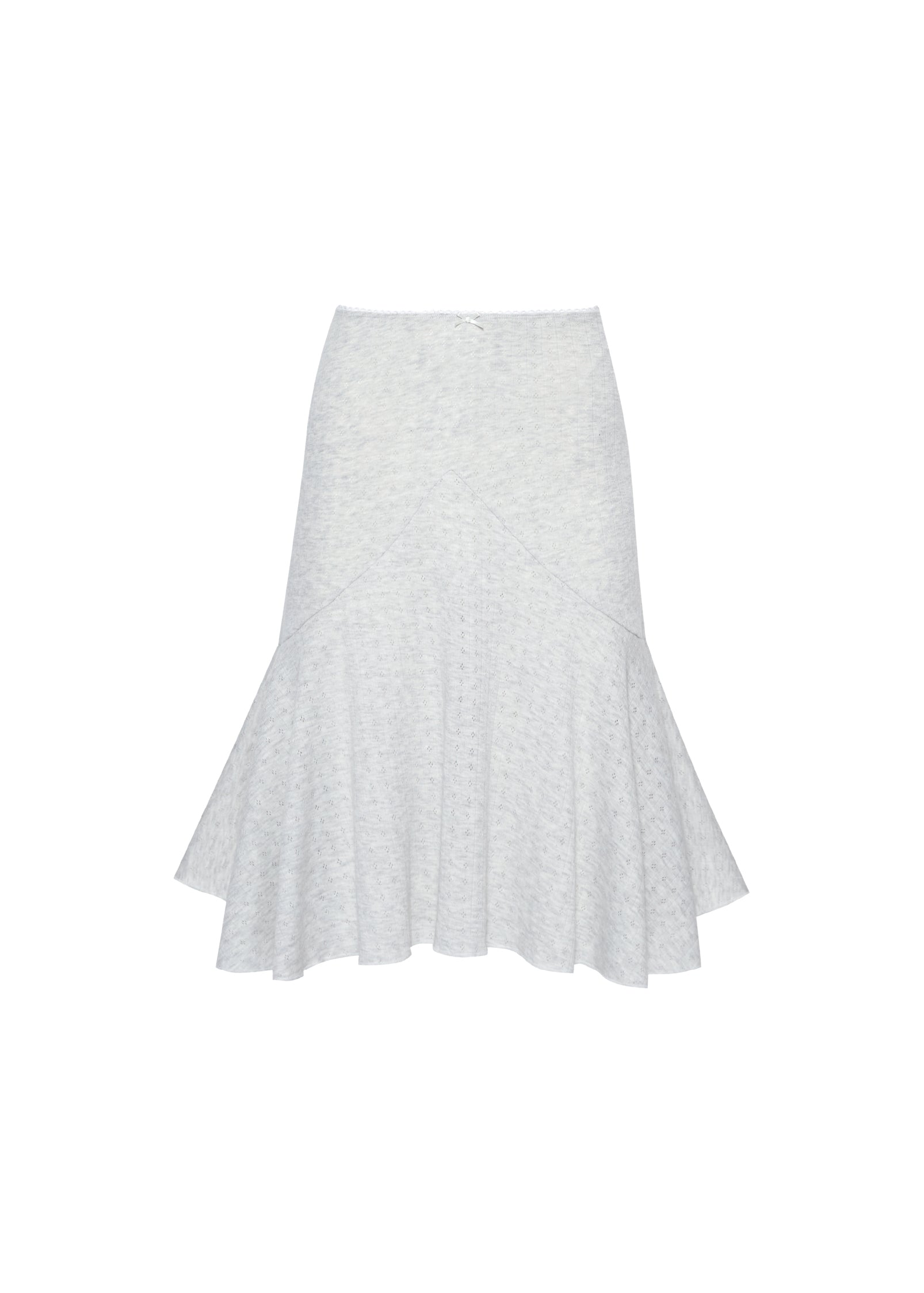 The "Pointelle Love Midi Skirt" features an elasticized waistband, a ruffled asymmetric hem, scalloped picot-trim detailing, and a petite center-front bow, adding a charming and lovely touch to any outfit. made from 100% cotton pointelle
