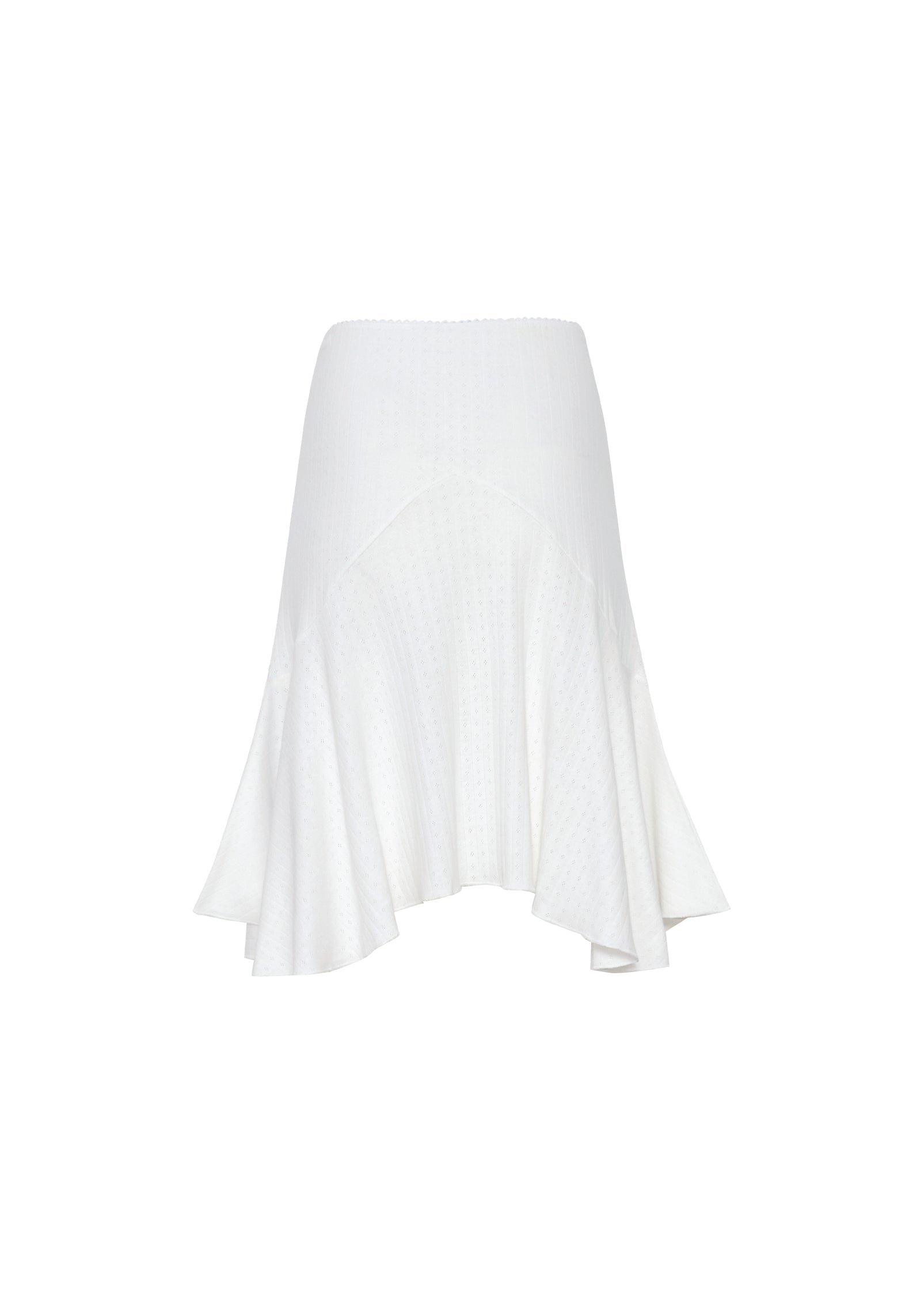 The "Pointelle Love Midi Skirt" features an elasticized waistband, a ruffled asymmetric hem, scalloped picot-trim detailing, and a petite center-front bow, adding a charming and lovely touch to any outfit. made from 100% cotton pointelle