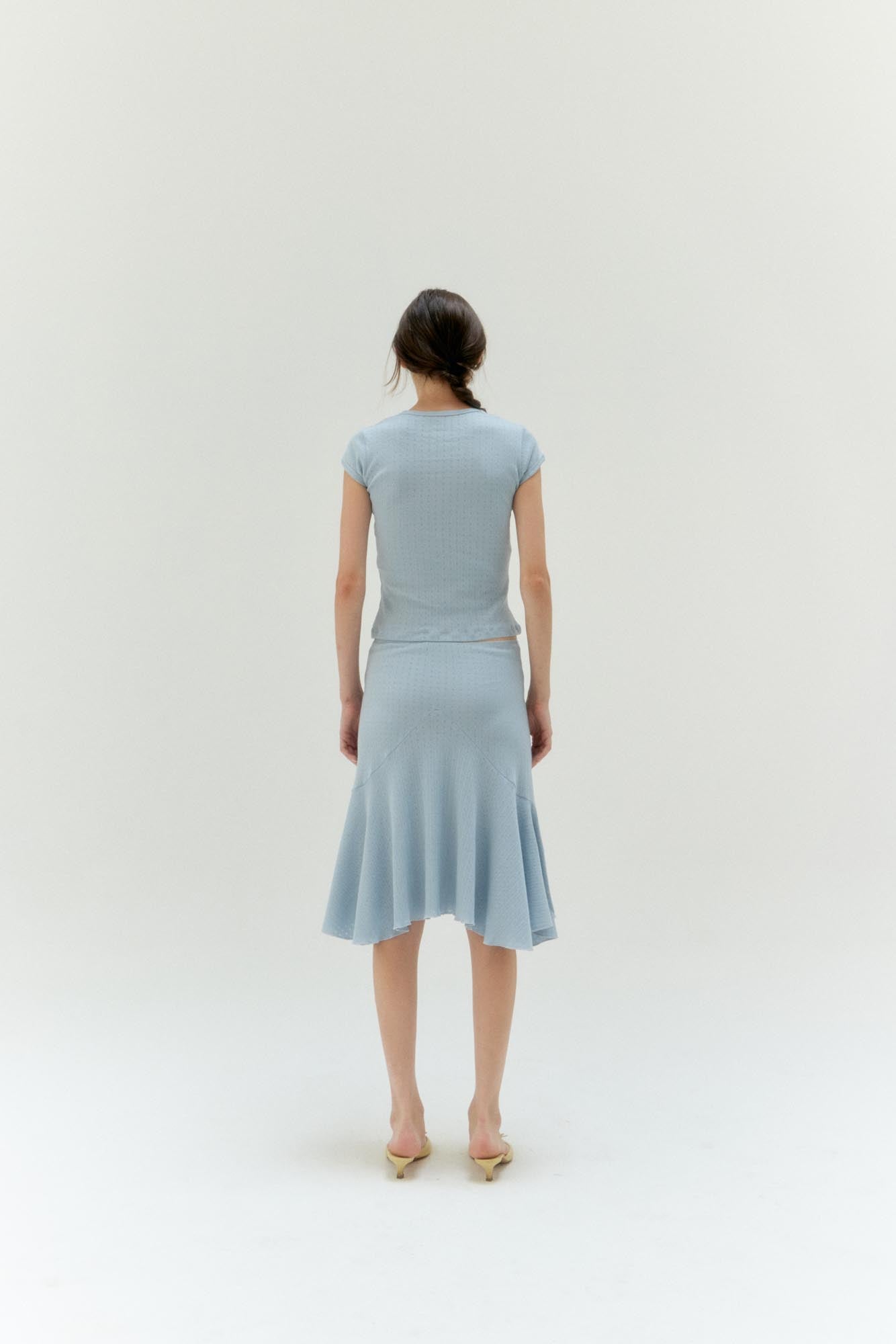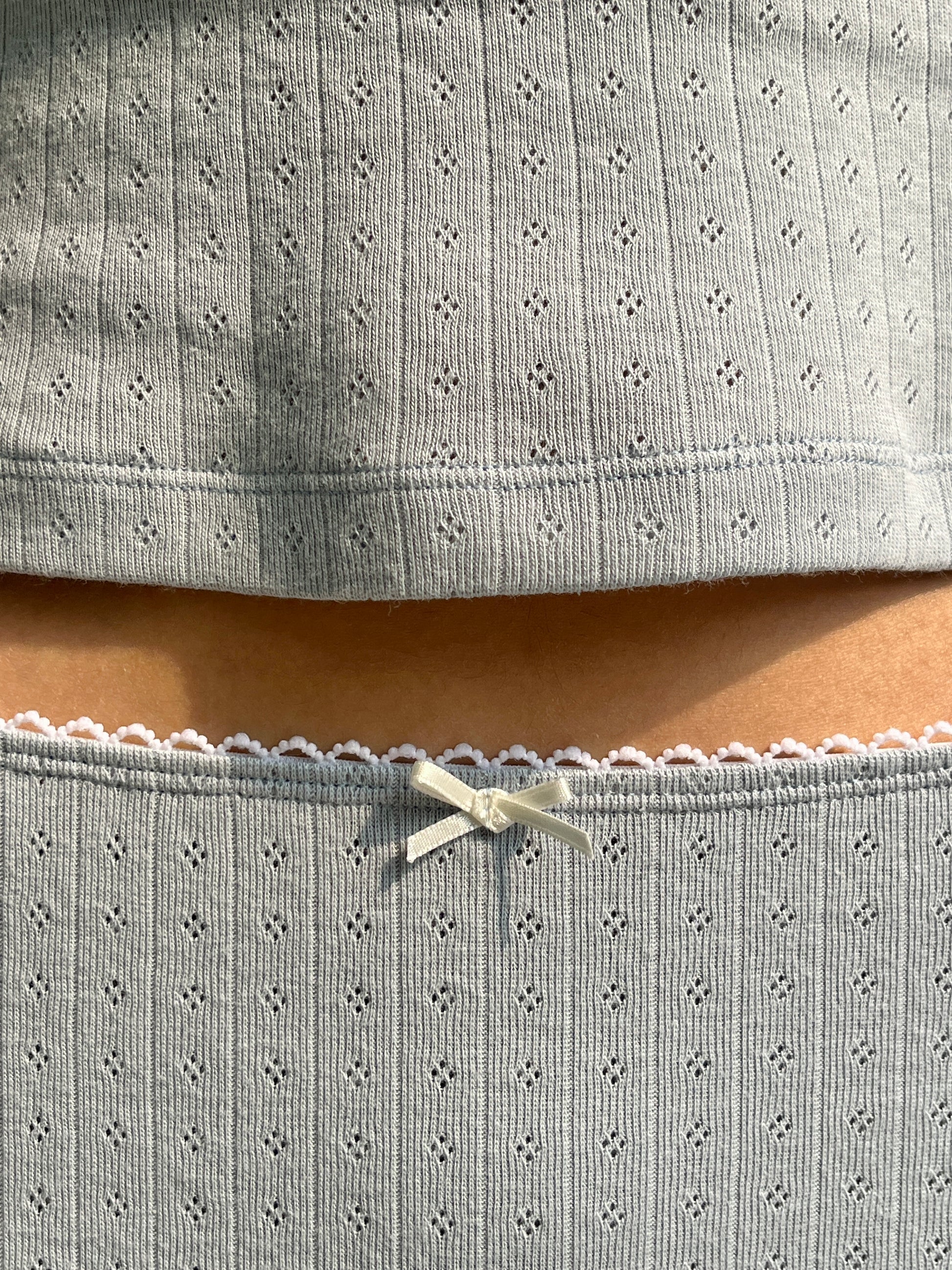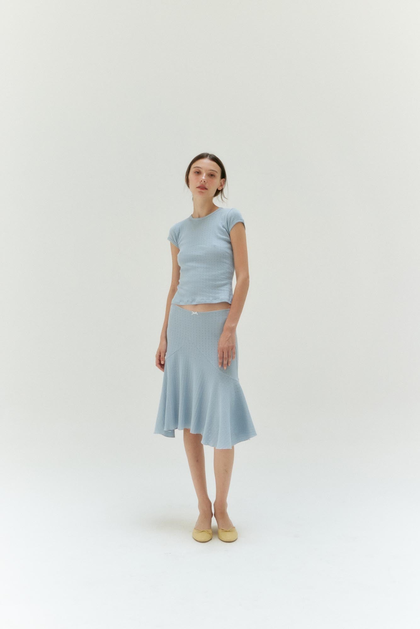 The "Pointelle Love Midi Skirt" features an elasticized waistband, a ruffled asymmetric hem, scalloped picot-trim detailing, and a petite center-front bow, adding a charming and lovely touch to any outfit. made from 100% cotton pointelle