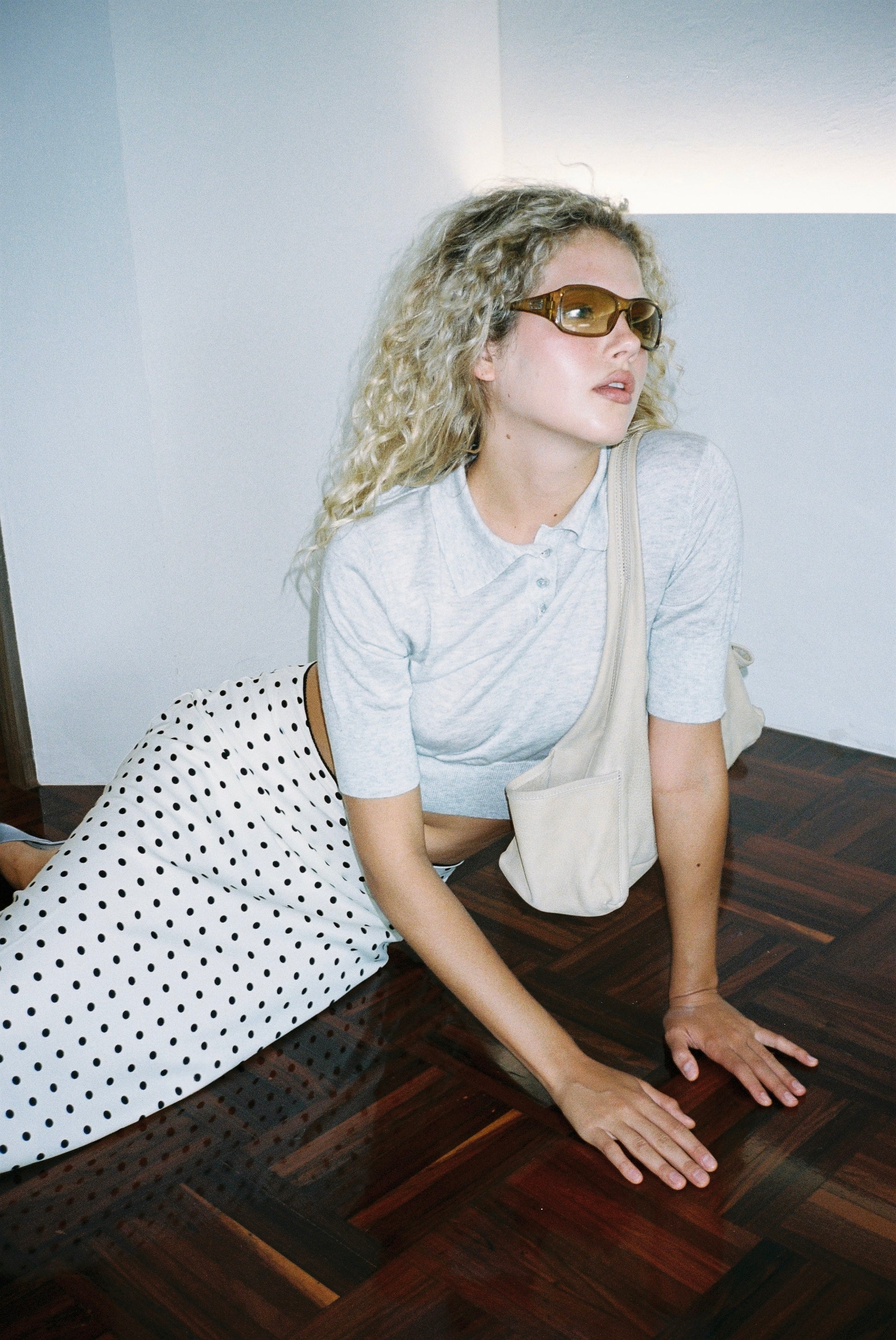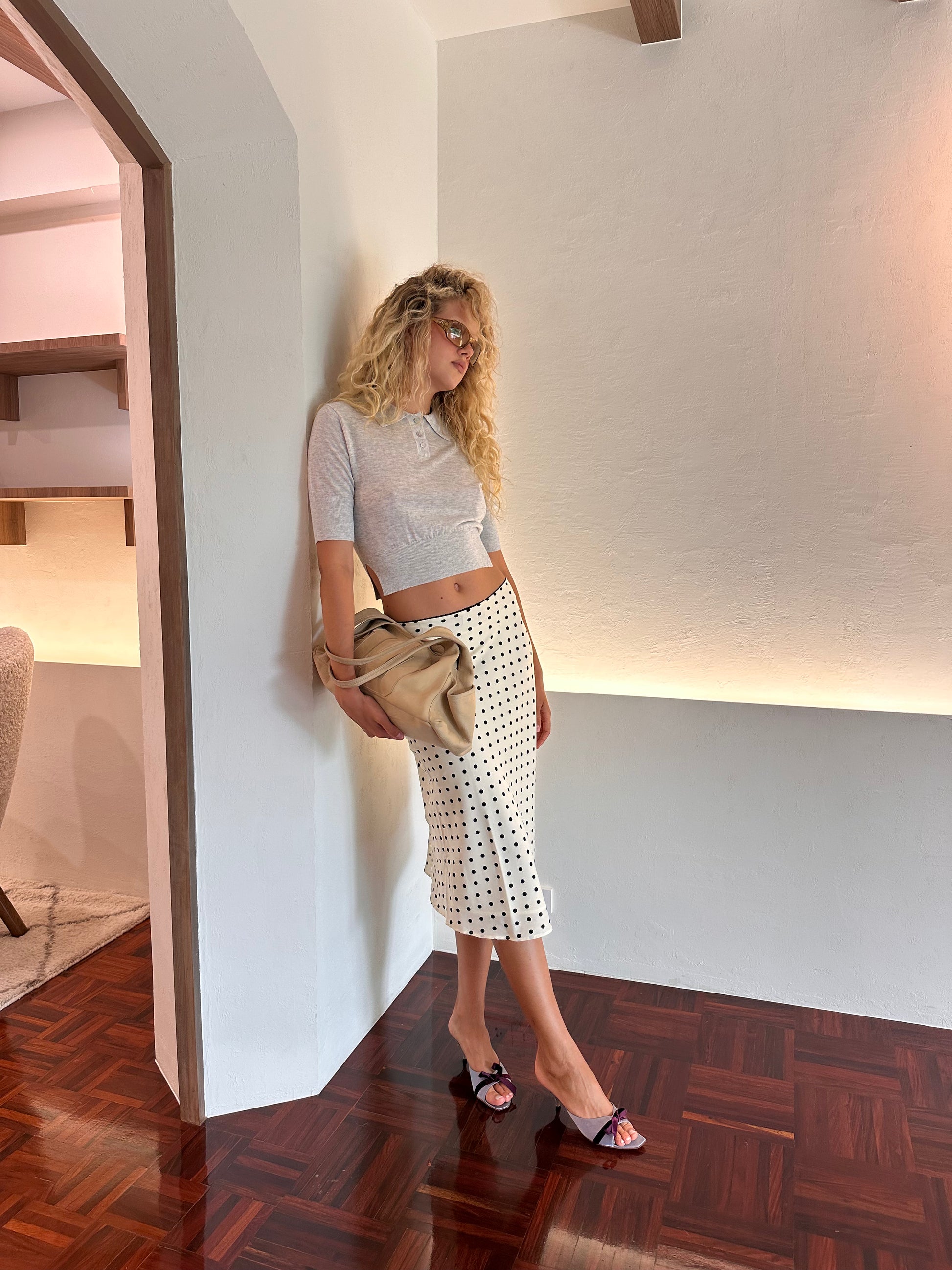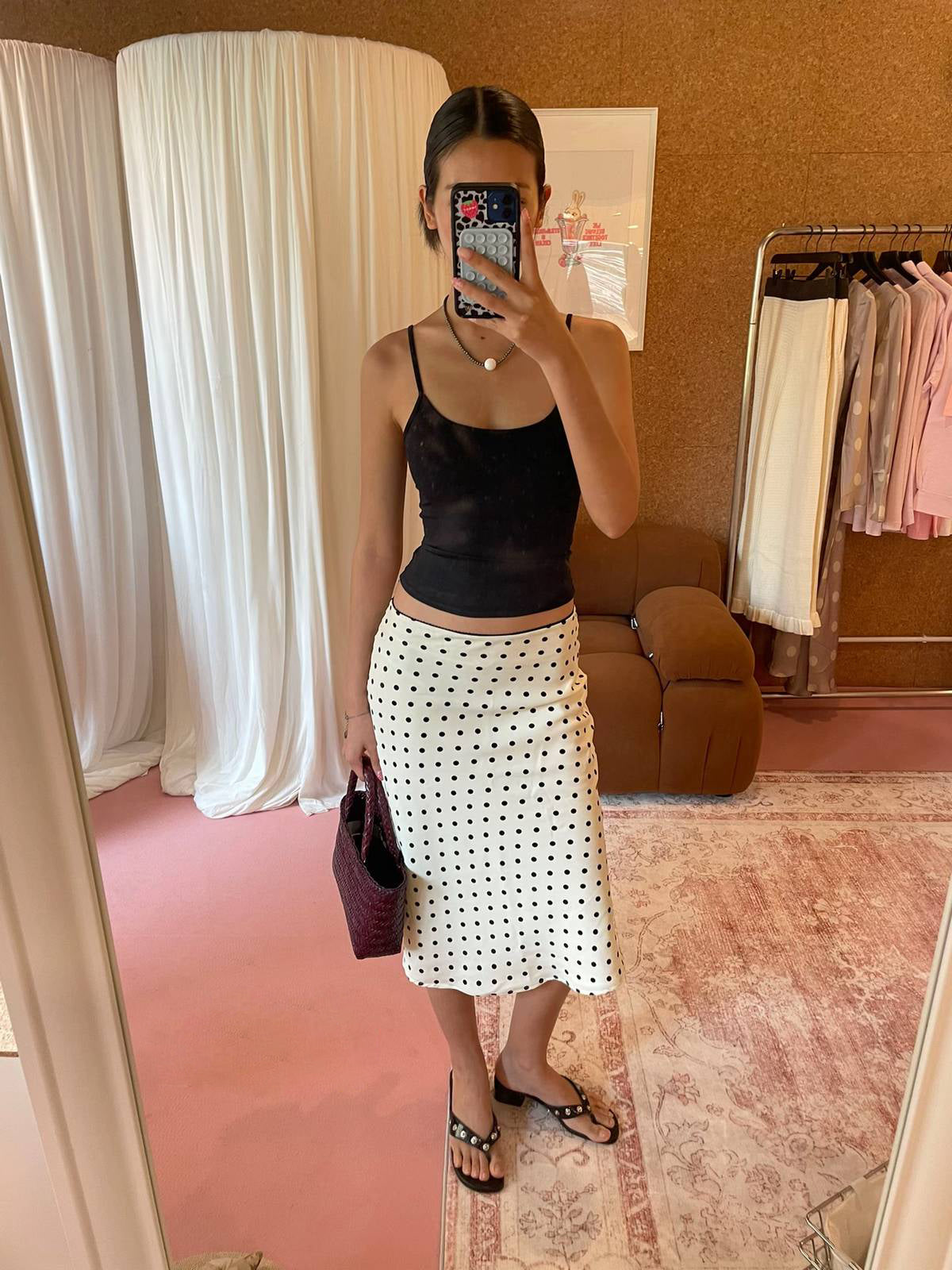 Low-rise midi skirt. Elastic waistband with lace trim detail. No zip. Can be worn high waisted or on the hip (size larger for hip wear), is sheer and see-through.