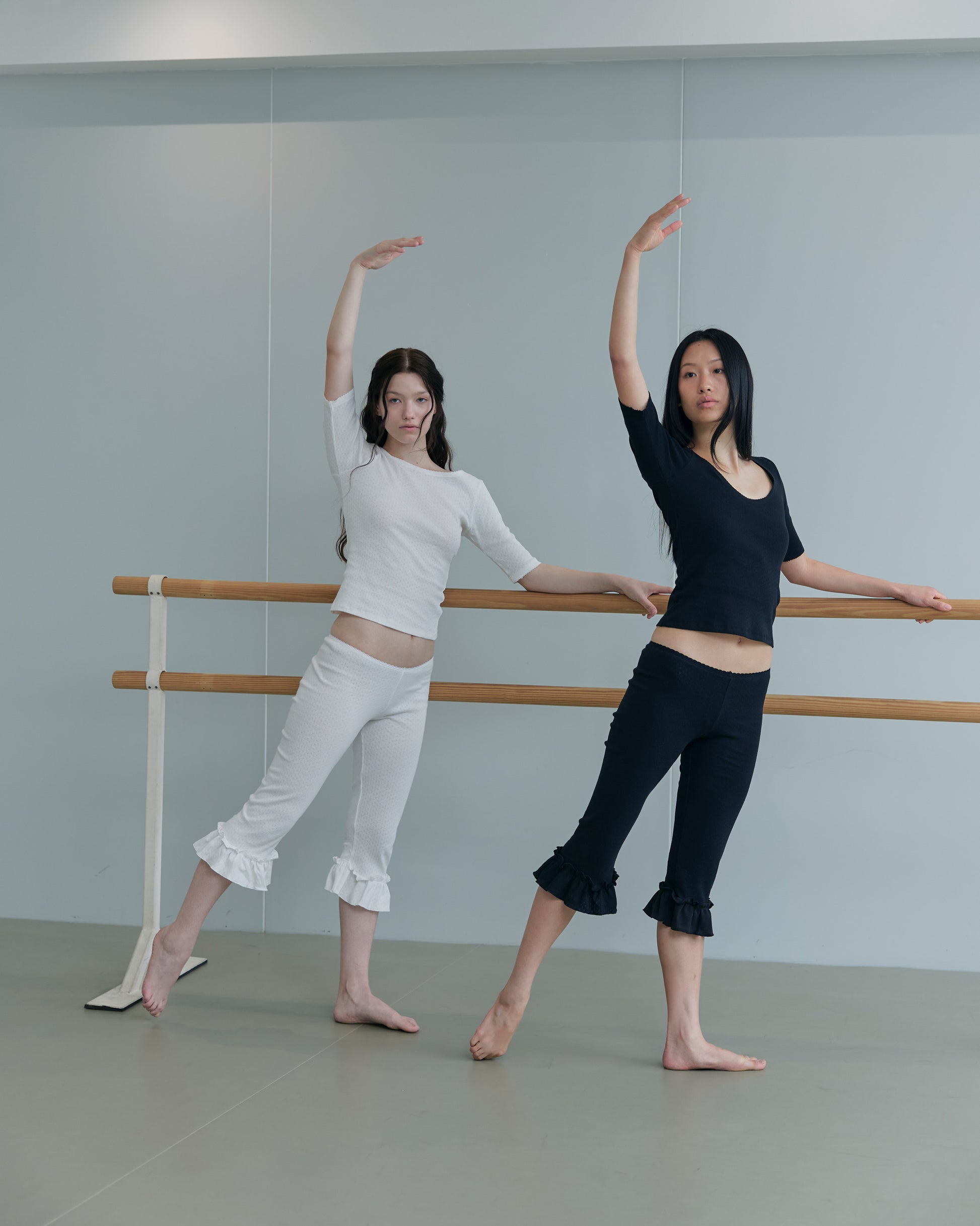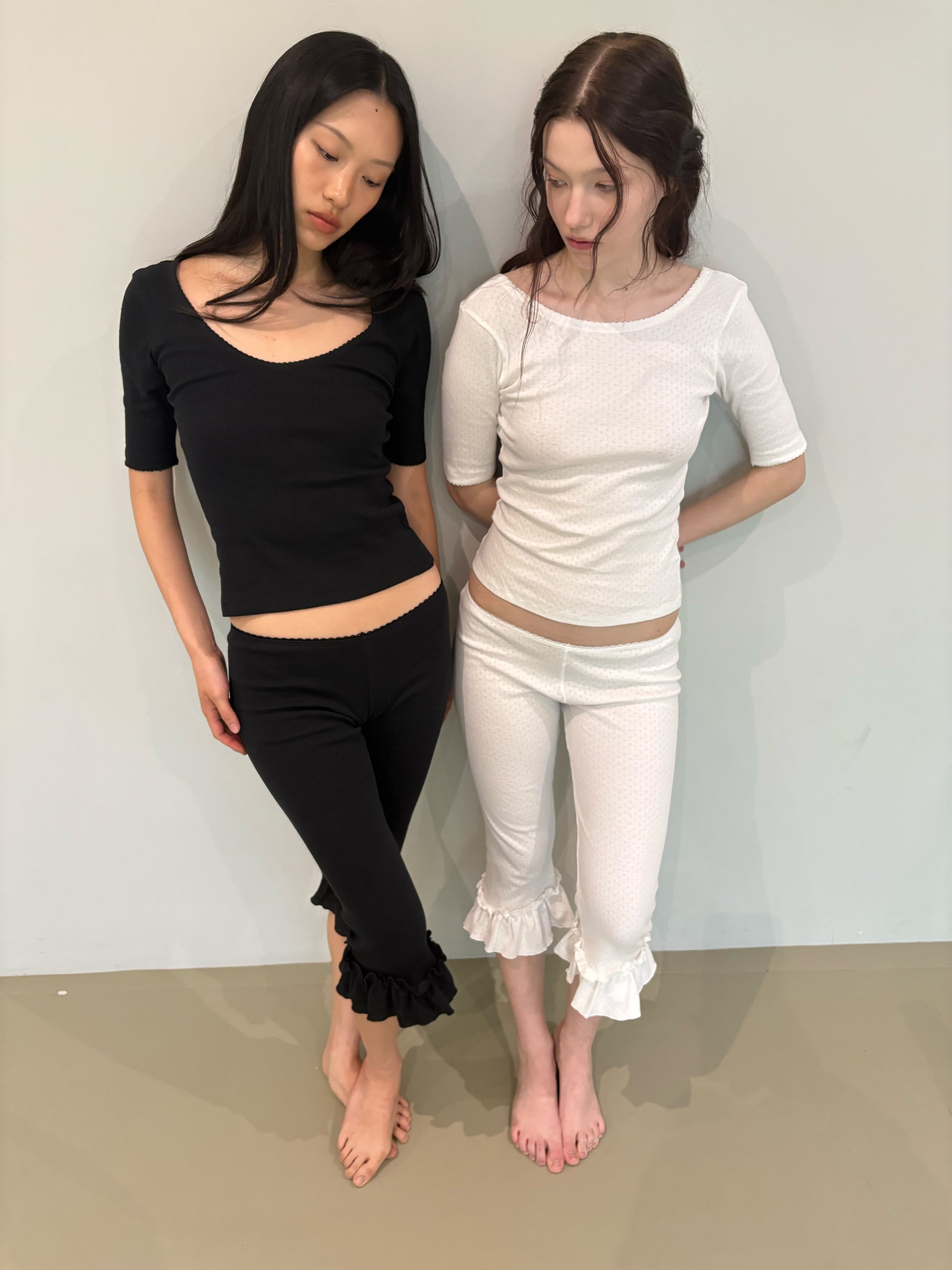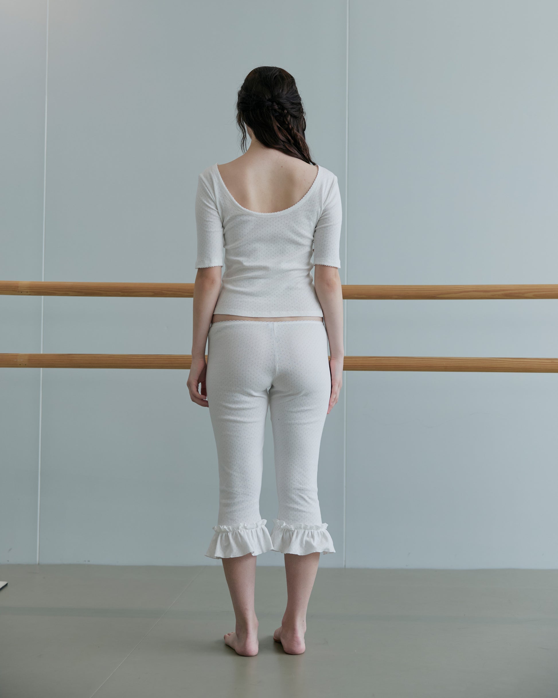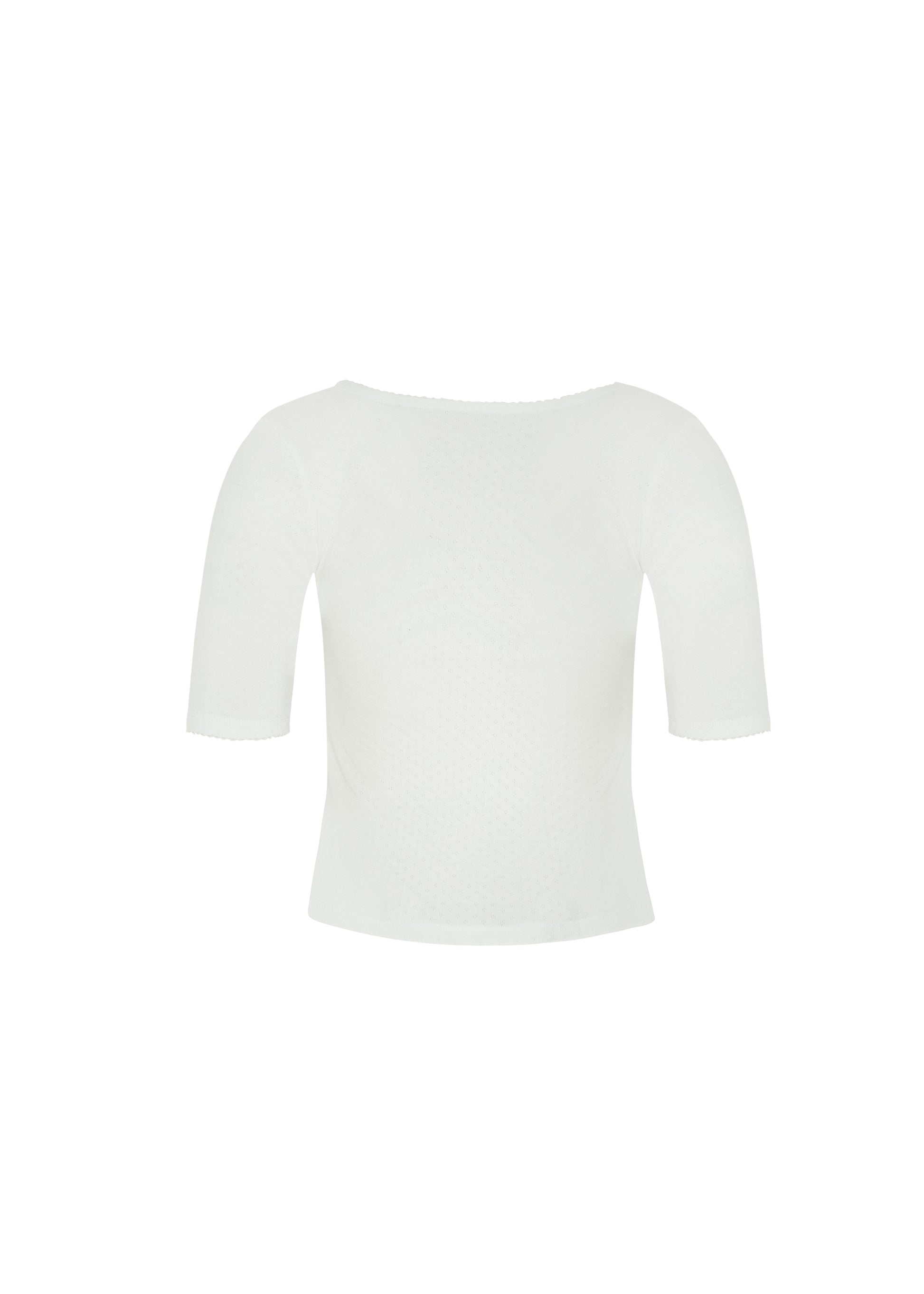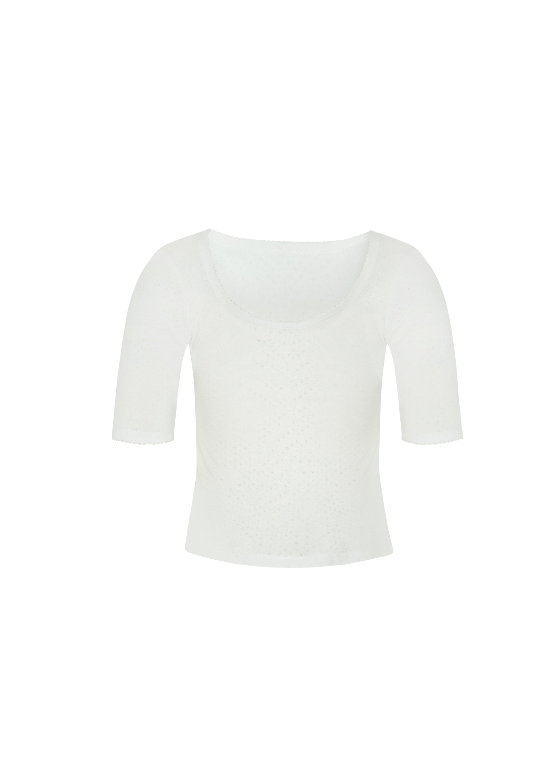 Reversible design with a low-cut front or back, offering versatile styling. Features elbow-length sleeves with delicate picot lace trim at the neckline and cuffs. Crafted from fine cotton rib pointelle for a soft, structured fit that sits comfortably close to the skin.